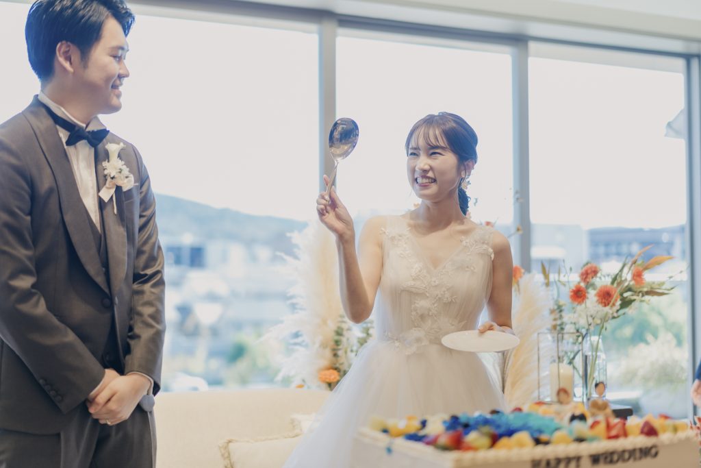ウェディングパーティでは、天気を味方につけたおふたりがテラスからご入場!和やかな雰囲気でご披露宴が進み、待ちに待ったケーキセレモニー♪おふたりのウェディングケーキは、プロポーズの場所である海をイメージし、ゲストの皆様と一緒に作り上げる世界にたったひとつの特別なウェディングケーキです!