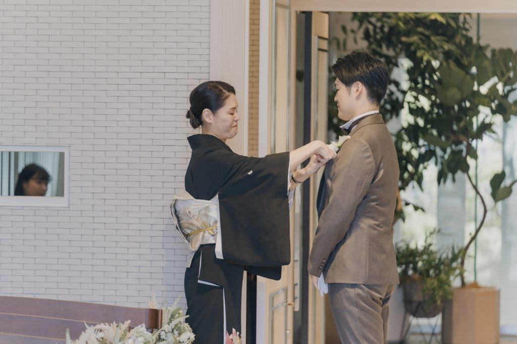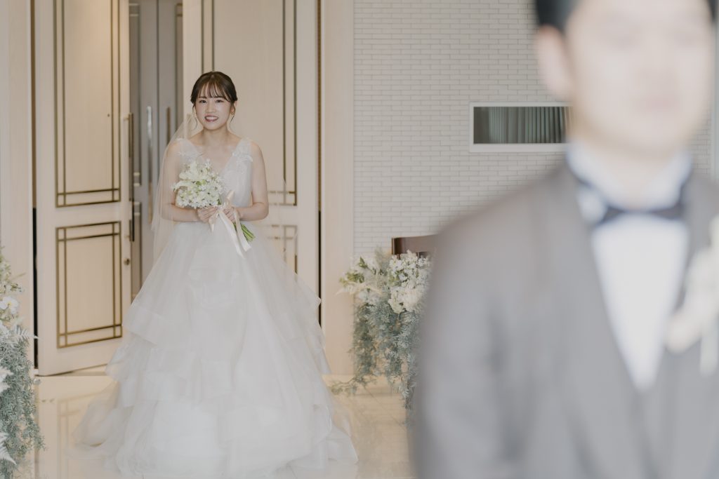 いつも明るくおふたりが過ごす空間には自然と笑顔が溢れます。結婚式の始まり、ファーストミートでは少し緊張したご様子も。おふたりを祝福する秋晴れの空のもと、最高の笑顔でご対面いただき、幸せ溢れる一日がスタートします。