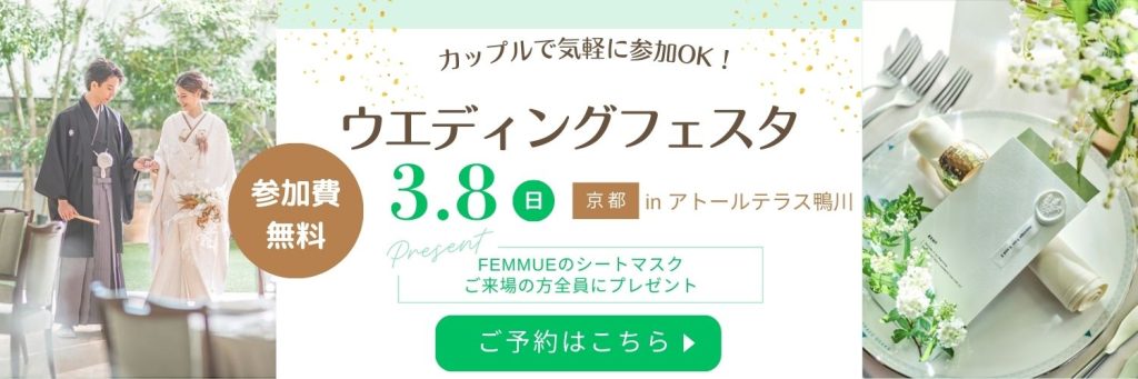 関西エリア最大級のウエディングイベント「カップルで気軽に参加OK!ウエディングフェスタ in京都」が、いよいよ3/8(日)に開催されます。