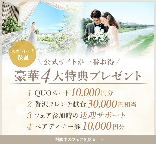 シェフ渾身の京フレンチの豪華試食など、内容や日にちに関わらずブライダルフェアはいつでも参加無料。彼も満足いただける内容ですので、ぜひお気軽にお越しください!